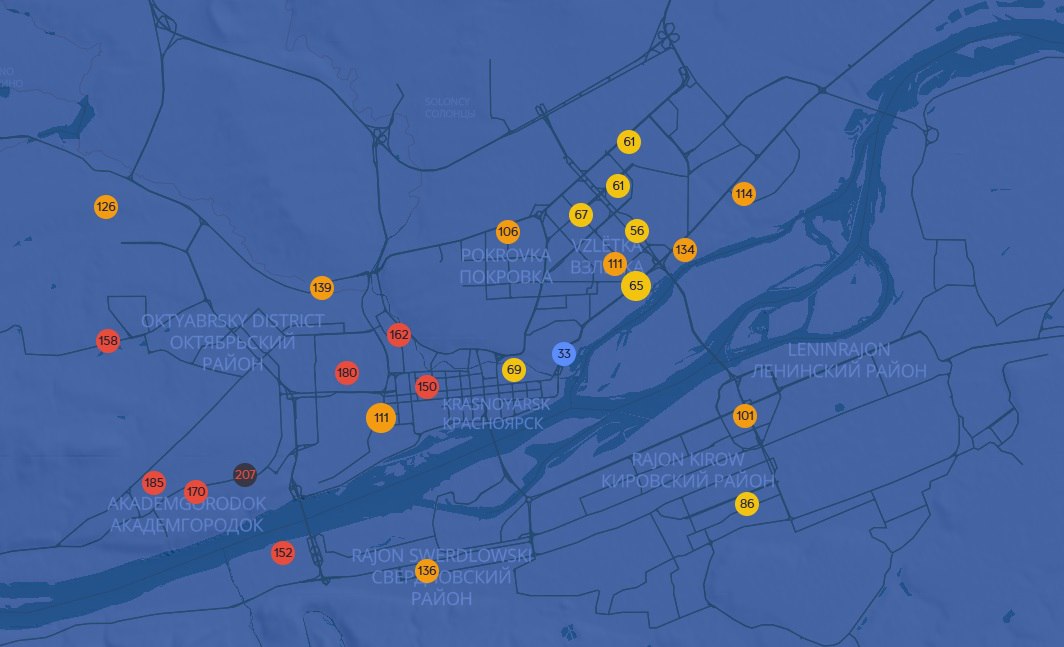 По красным точкам (и одной черной) видно, что тяжелее всего сейчас в Железнодорожном районе и Академгородке.