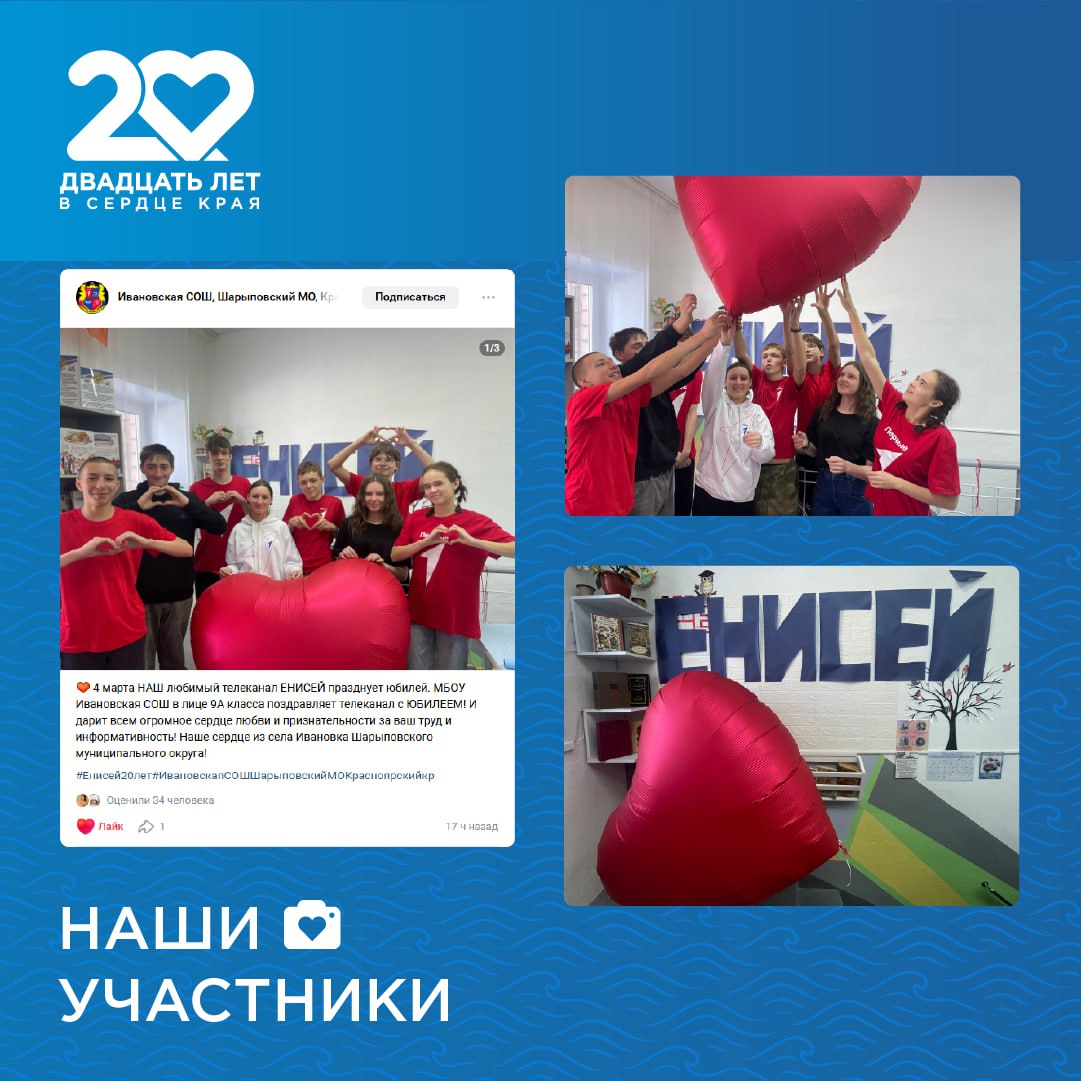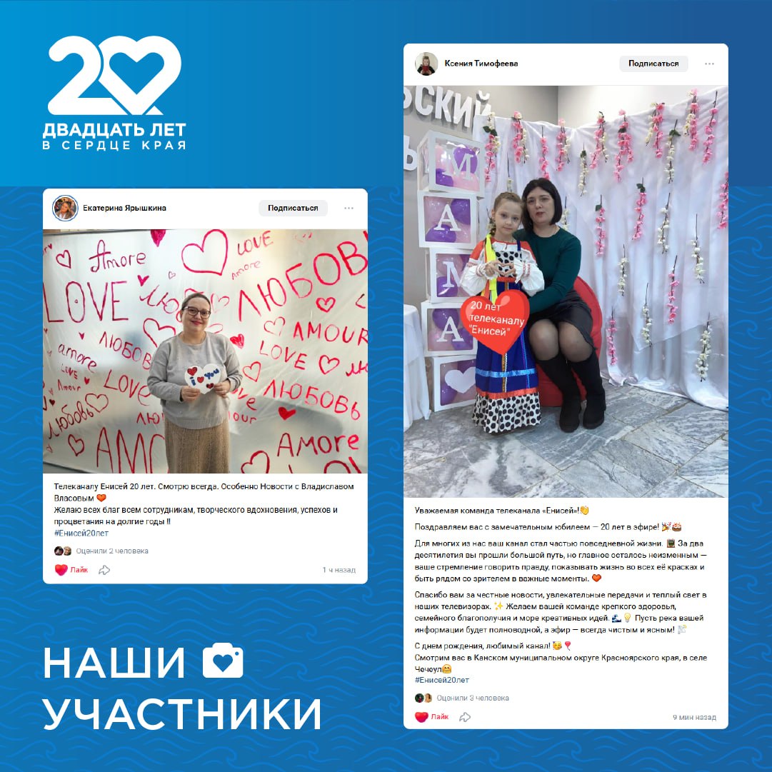4 марта мы вместе с вами отпразднуем 20-летие телеканала! А поздравления принимаем уже сейчас. Нам шлют сердечки зрители из Красноярска, Енисейского, Шарыповского, Емельяноского, Канского, Богучанского округов, села Шалинское, Балахты и не только. Как же приятно знать, что «Енисей» – ваш любимый канал!