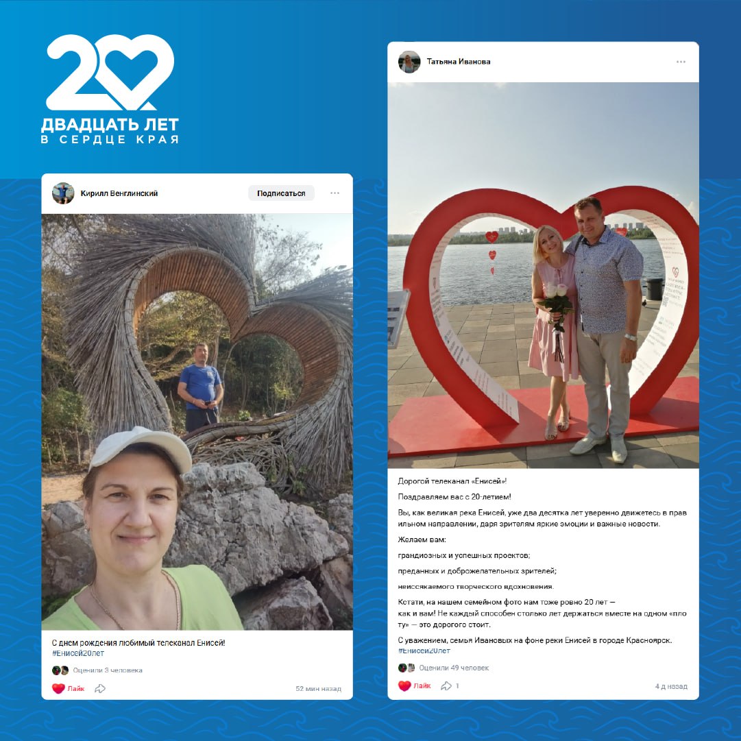 Если вы тоже хотите нас поздравить, опубликуйте на своей странице в ВК или «Одноклассниках» фото с сердцем. В подписи напишите свои пожелания и где смотрите нас. Добавьте хештег #Енисей20лет. Авторы 5 фото, которые понравятся нам больше всего, получат подарки.