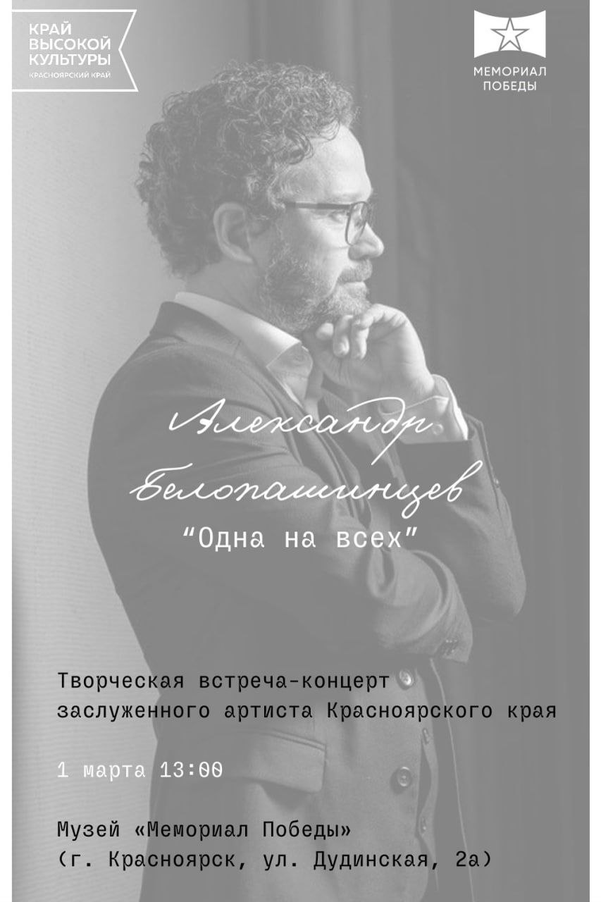 Вас ожидает концерт, посвящённый Году единства народов России, с участием Красноярского духового оркестра. Также в этот вечер состоится творческая встреча-концерт «Одна на всех» с Александром Белопашинцевым.