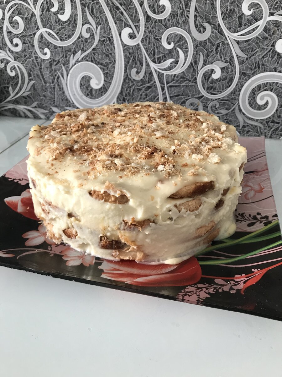 Теперь можно приступать к сборке торта. На дно формы для выпечки выложите первый слой слоеного печенья «Ушки». Сложите печенье так, чтобы оно не сломалось. Далее, щедро промажьте печенье кремом — чем больше крема, тем вкуснее будет торт! Повторите этот процесс, укладывая слои печенья и крема, пока не исчерпаете все ингредиенты.
