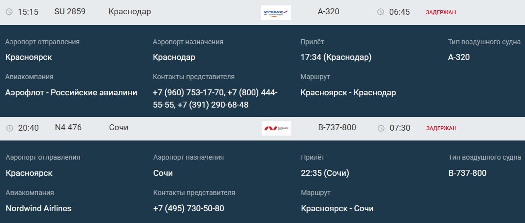 Также перенесен вылет рейса в Краснодар – с 6:45 до 15:15. Прилет самолета Краснодар – Красноярск ожидается в 21:17.
