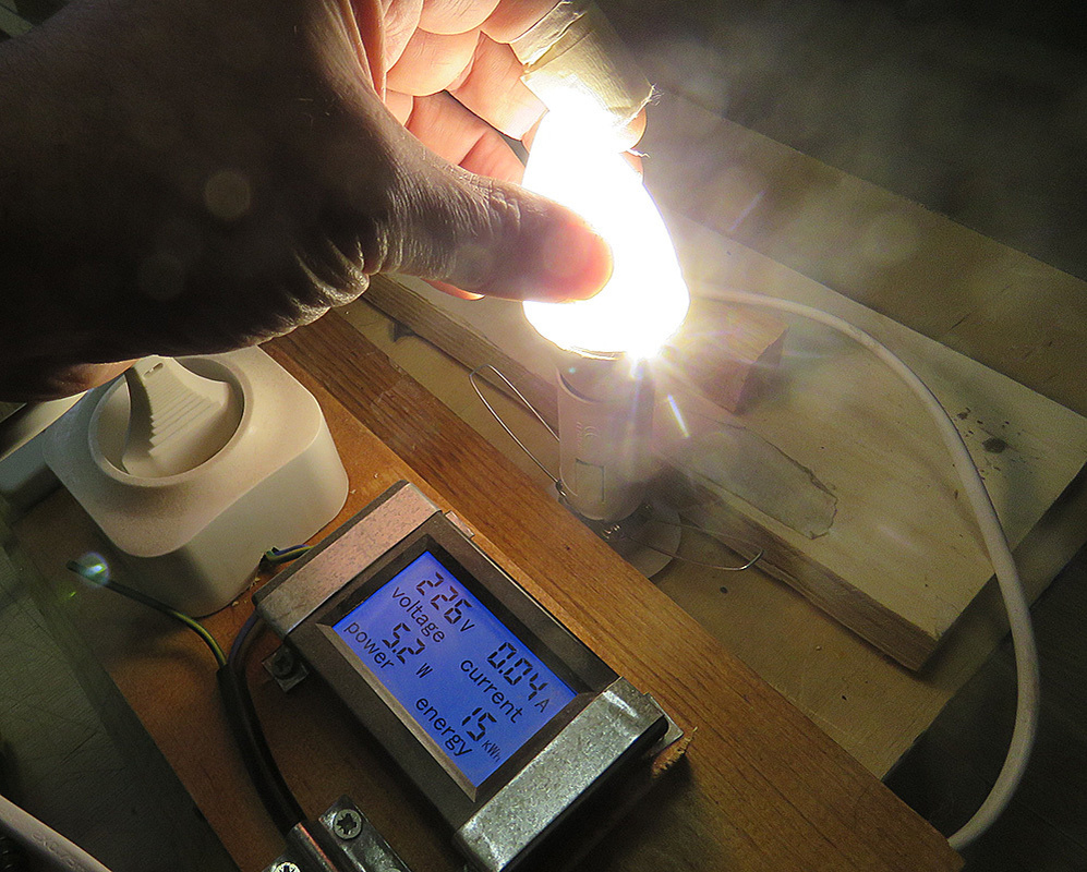 После успешного ремонта лампу подключили к системе измерения мощности. Она показала потребление 5,1-5,2 Вт и исправно загорелась. Для проверки яркости отремонтированных ламп было решено провести сравнение с новой светодиодной лампой Philips мощностью 7 Вт, которая потребляет 6,6 Вт и выдаёт освещенность в 285 лк.