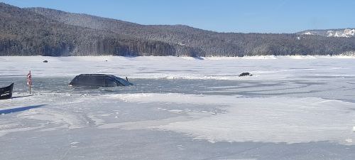 На Красноярском водохранилище рыбаки спаслись из провалившейся под лед машины.