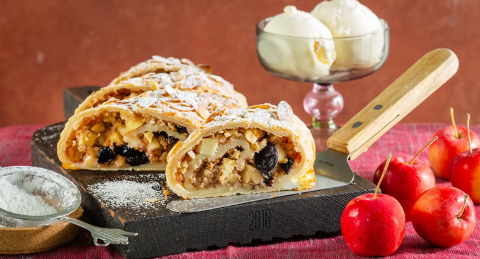 - Выпекание: Взболтайте желток с молоком и смажьте им рулет. Включите духовку и разогрейте ее до 200°C. Выпекайте штрудель 30 минут до золотистой корочки. Подавайте с посыпкой сахарной пудрой и шариком мороженого.