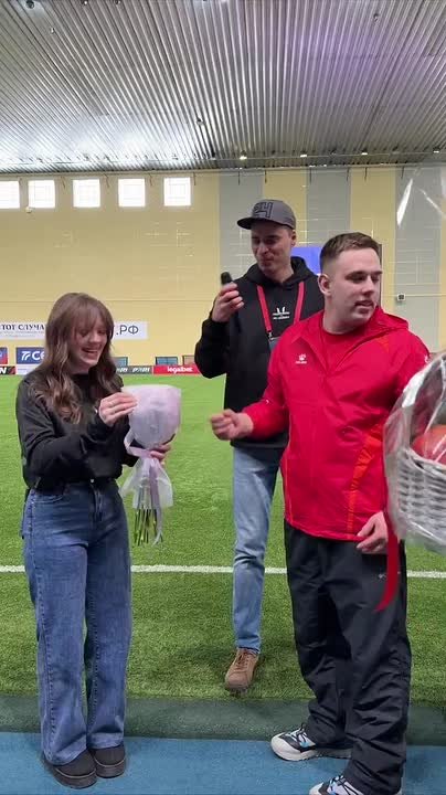 Первыми молодоженов поздравили партнеры клуба и несколько тысяч зрителей на трибунах.