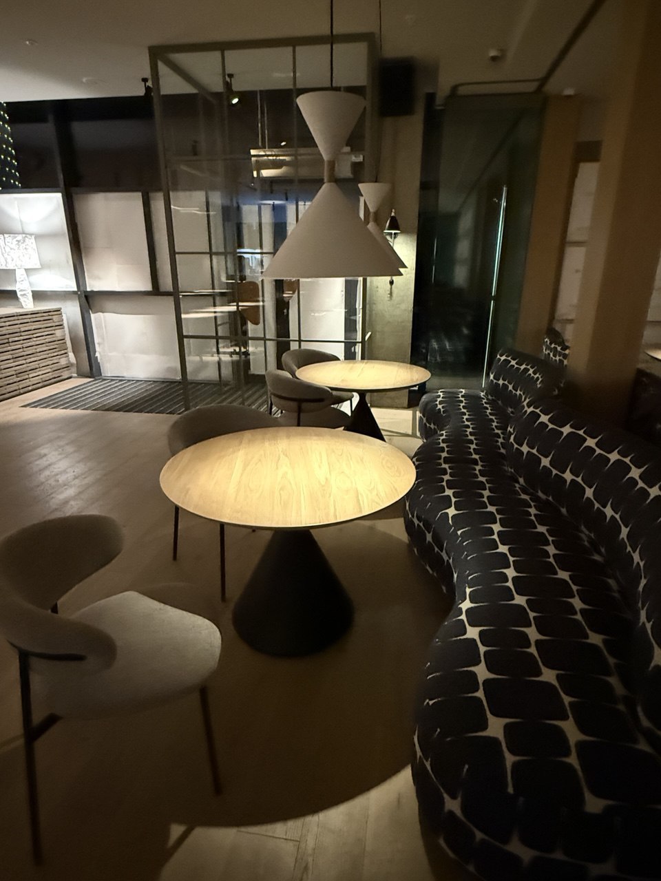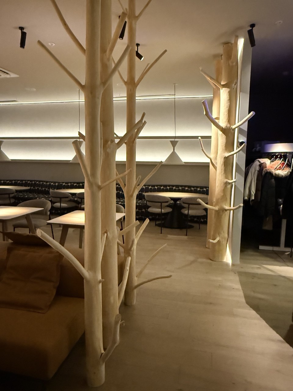 Интерьер ресторана разработала Валентина Дружинина. Оформлено пространство в стиле japandi – скандинавский уют смешивается с японской лаконичностью. Все из натуральных материалов, мягкий свет, а панорамные окна выходят на лестницу к Серебряному логу.
