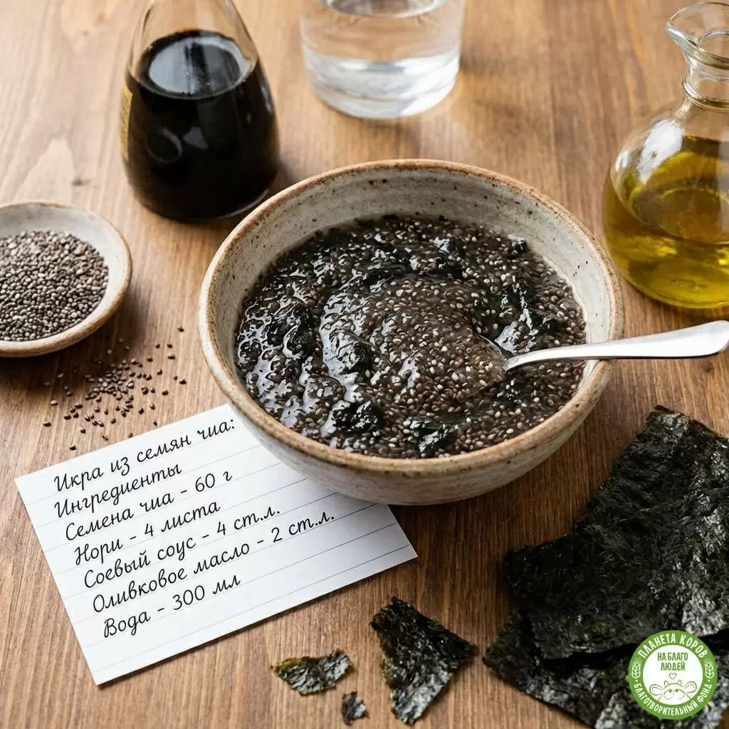 Заваренные чиа набухают до желеобразной массы, а нори дают легкую хрусткость и глубокий аромат моря. Вместе они создают легкую, ненавязчивую закуску на любой стол.