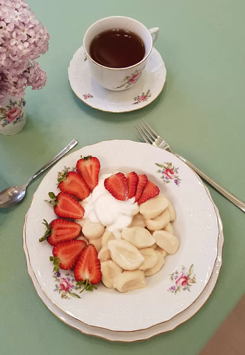 Как только галушки готовы, их выкладывают на красивое блюдо, добавляют кусочки сливочного масла и раскладывают по тарелкам. Блюдо щедро поливают сметаной и украшают свежей клубникой, создавая настоящую кулинарную симфонию. Это изысканное лакомство станет достойным дополнением к любому столу.