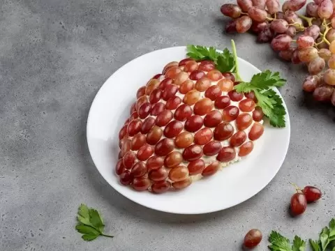 На плоском блюде майонезом обозначьте очертание виноградной грозди. Выложите первый слой из куриного филе, присыпьте специями по желанию, затем смажьте майонезом и посыпьте орехами.