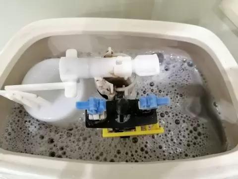 - Снимите механизм с бачка и замочите его в растворе средства. Это поможет вернуть детали к первоначальному состоянию.