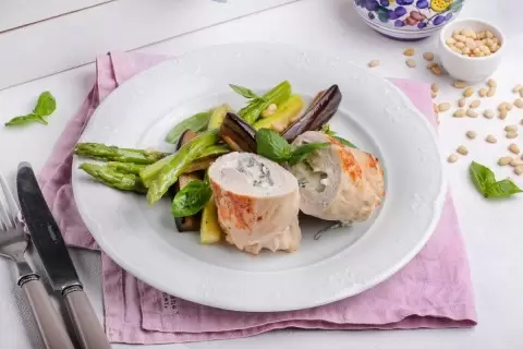 Обжарка и запекание: Разогрейте сковороду с растительным маслом и обжарьте рулетики по 1-2 минуты с каждой стороны на сильном огне. Затем переложите их на противень и запекайте в духовке 15-20 минут. Тем временем нарежьте кабачки и баклажаны дольками, посолите и обжарьте на сковороде с маслом 4-5 минут. В конце обжарьте спаржу 2-3 минуты до мягкости.