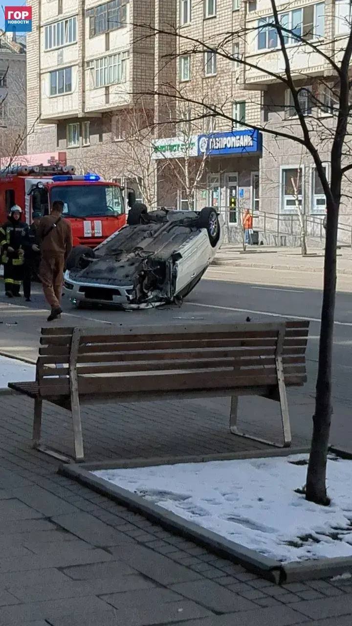 На остановке Робеспьера в Красноярске перевернулся автомобиль. Судя по снимкам, машина получила сильные повреждения – одно из колес оторвалось и оказалось на тротуаре.