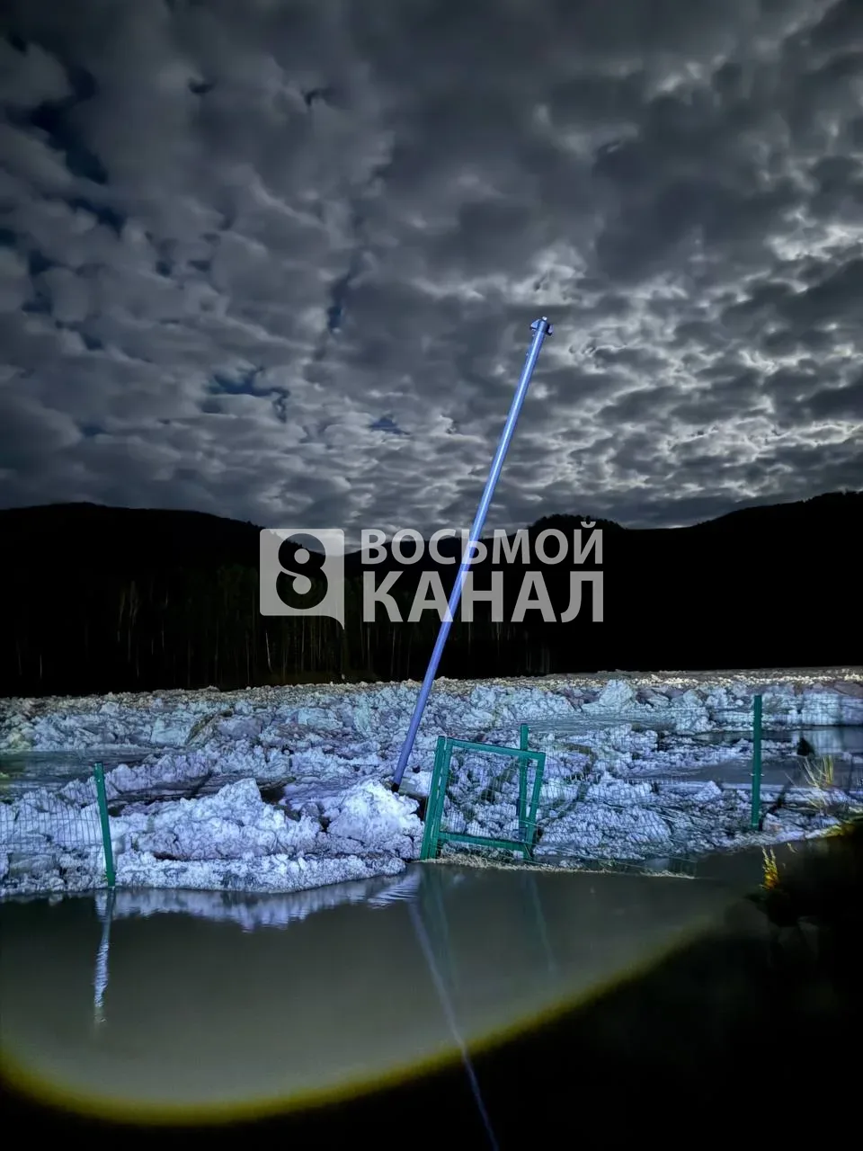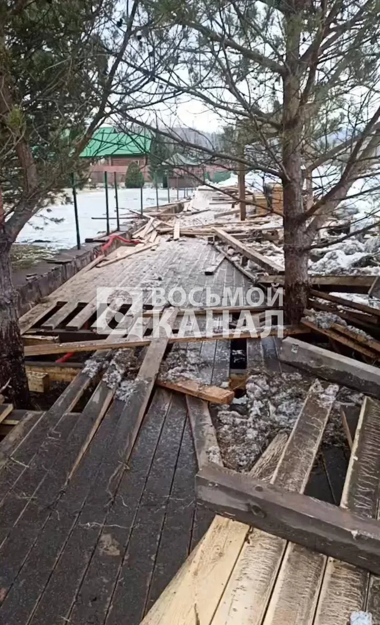 Фото с места событий в нашу редакцию прислали местные жители. Лёд поднял и сломал деревянный причал для плотов и лодок, а также повалил столбы уличного освещения.