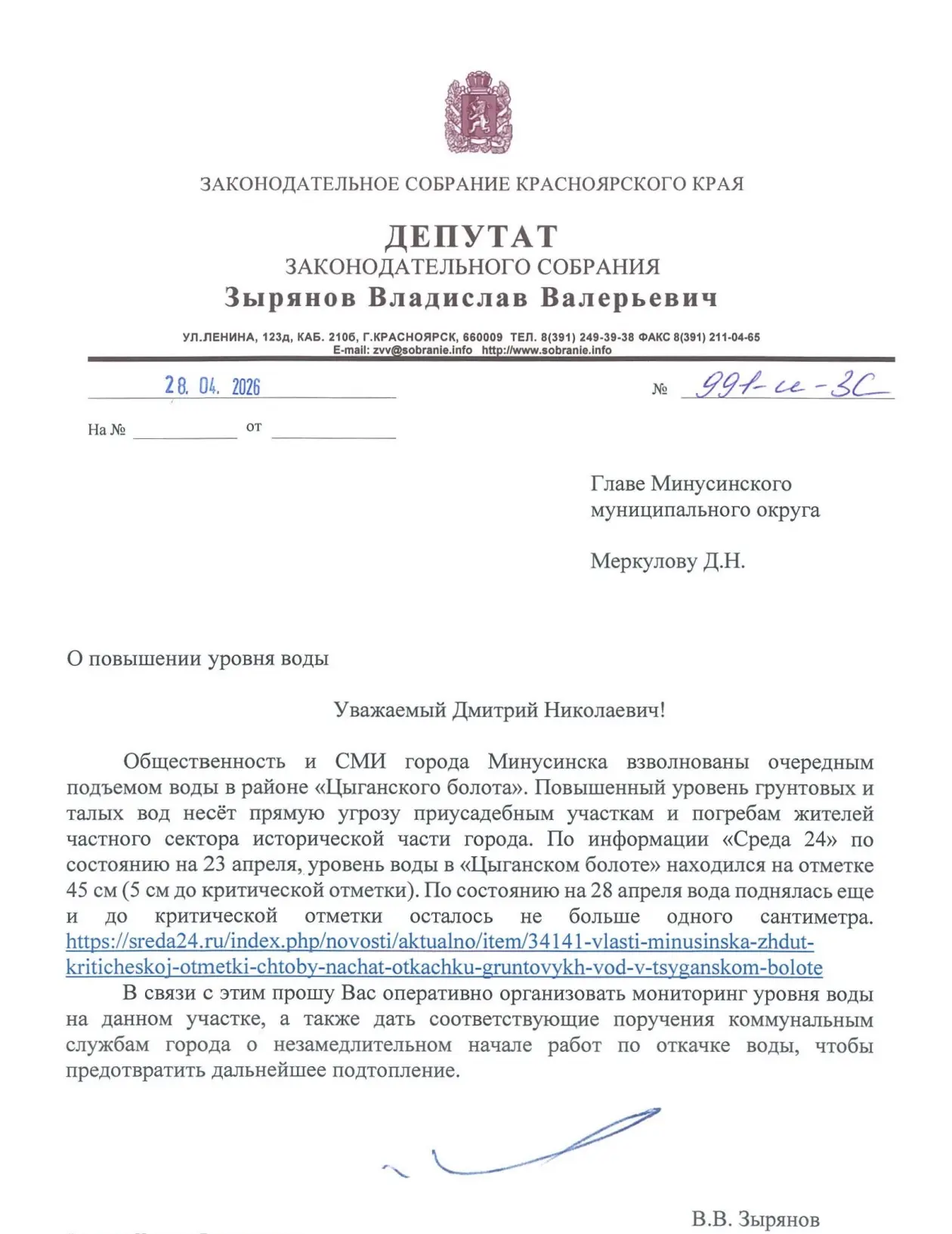Сегодня парламентарий Владислав Зырянов обратился к главе округа Дмитрию Меркулову с просьбой оперативно начать мониторинг уровня воды и незамедлительно приступить к работам по откачке.