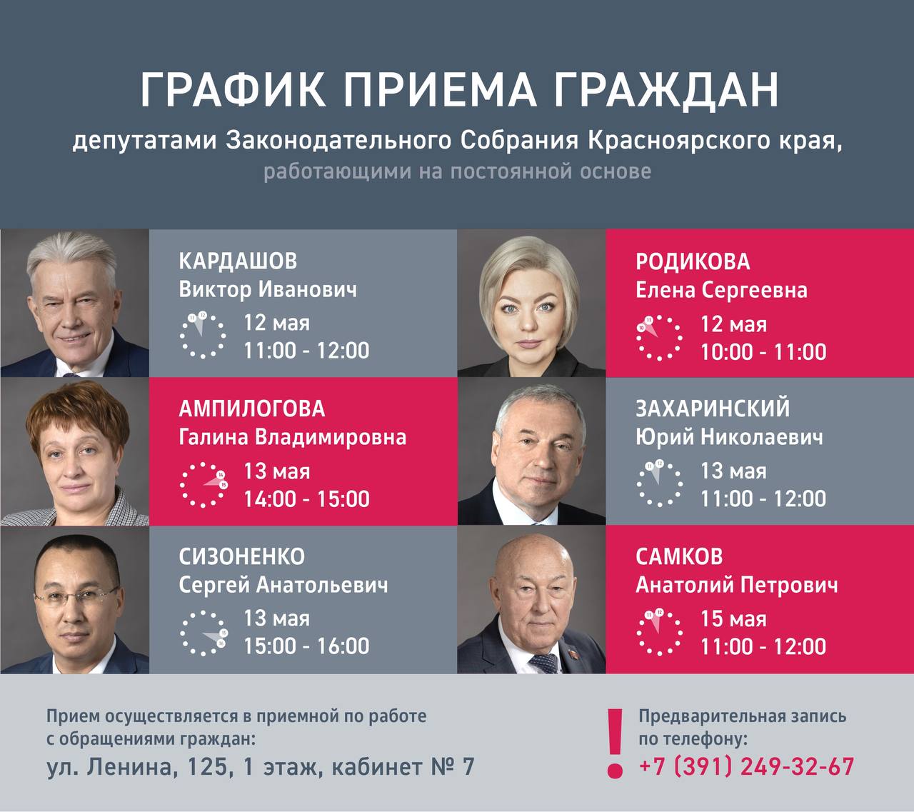 Прием осуществляется в приемной по работе с обращениями граждан: ул. Ленина, 125, 1 этаж, кабинет № 7.