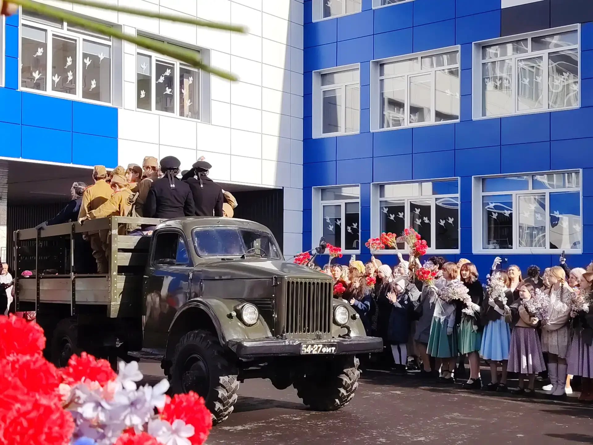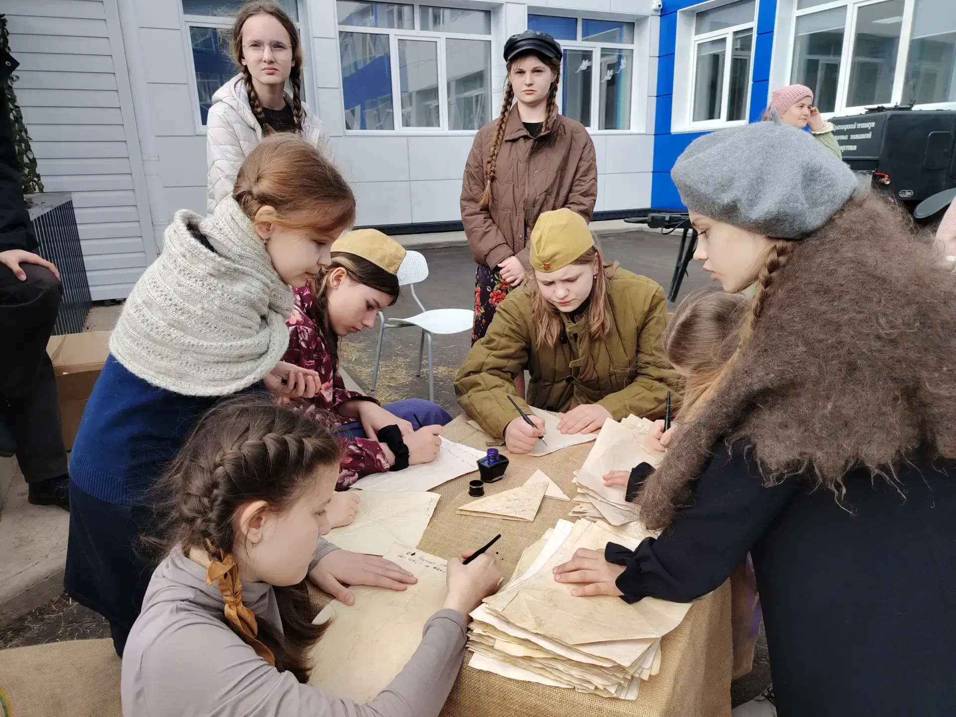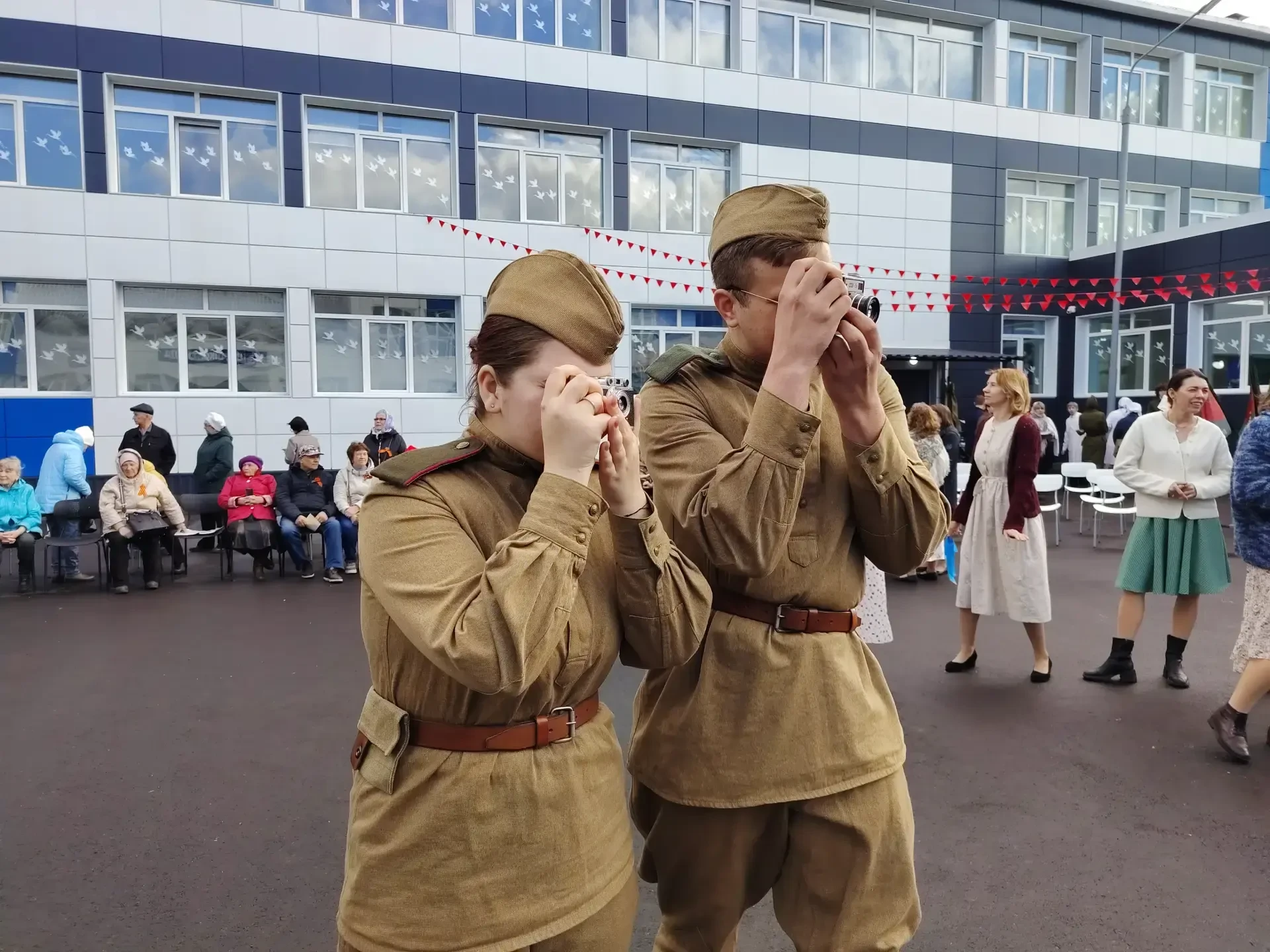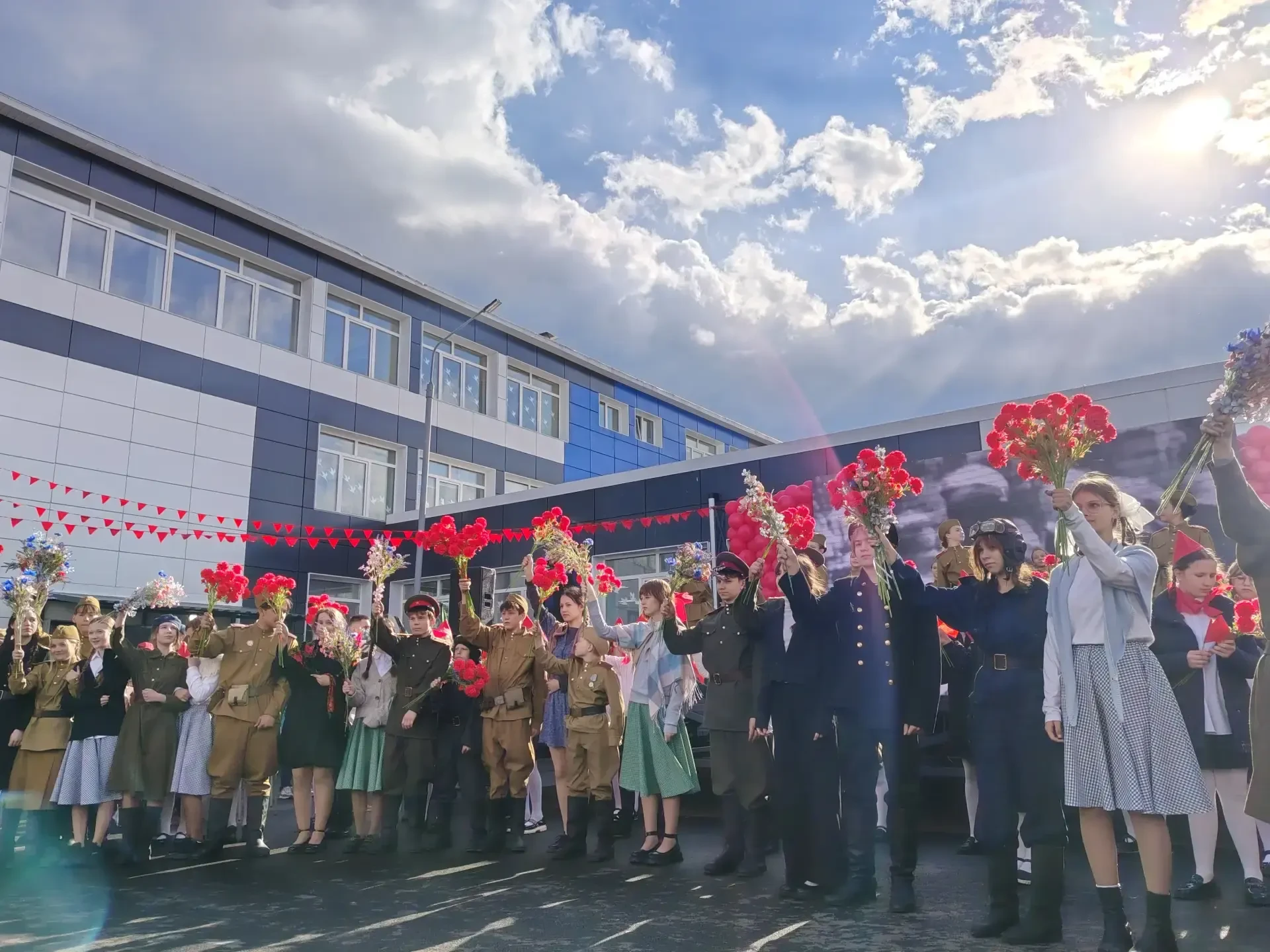 Среди 250 частников сами ребята, учителя, родители. На внутреннем школьном дворе зрители перенеслись в весну 1945 года и погрузились в атмосферу того самого Дня Победы. Организовали и тематические локации: полевая кухня, выставка ретротехники, военный оркестр исполнил известные и любимые песни военных лет.