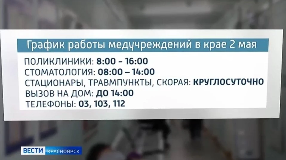 2 мая поликлиники края работают по особому графику. Прием врачей и диспансеризация: с 8 до 16 часов. В поликлиниках будут вести терапевты, педиатры, хирурги и гинекологи, открыты прививочные и процедурные кабинеты. В эти же часы окажут помощь в онкодиспансере. Взрослые и детские стоматологи принимают с 8 до 14:00 часов. Стационары, травмпункты и скорая работают круглосуточно.