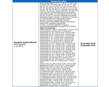 Подачу холодной воды прекратят сегодня, 3 декабря, с 23:00 до 23:00 4 декабря.Компания «КрасКом» пояснила, что причина отключения — в подтоплении тепловых сетей на магистральном водоводе, что требует незамедлительного проведения ремонтных работ.Список...
