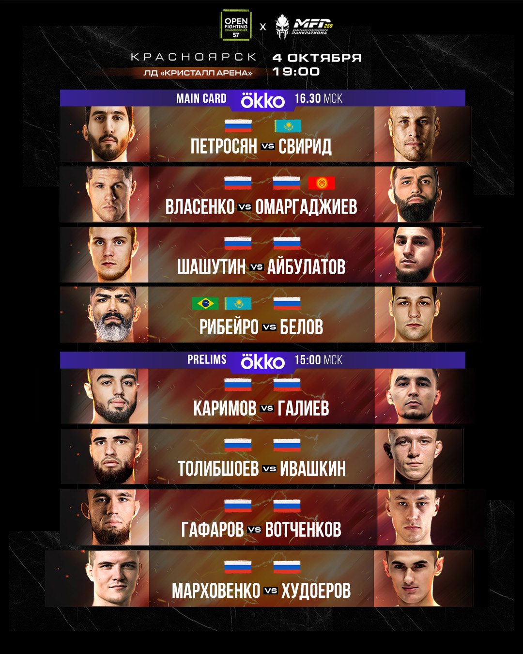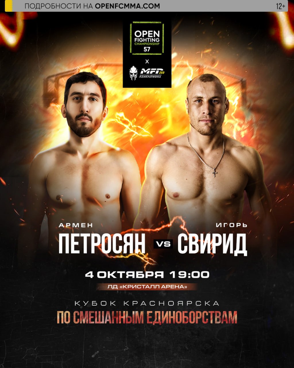 Главным событием турнира станет бой уроженца Красноярска, экс-бойца UFC Армена Петросяна и казахстанского спортсмена Игоря Свирида.