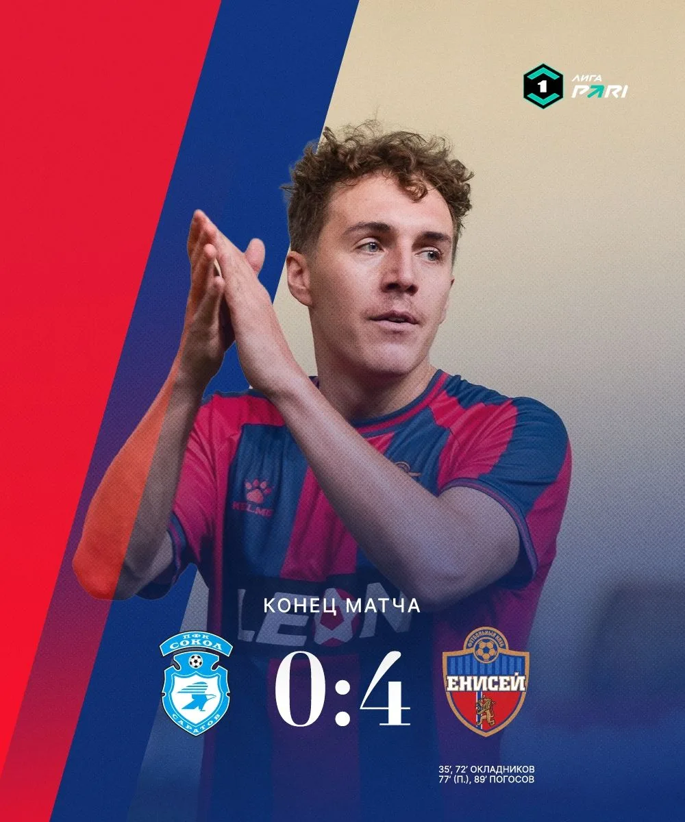 В матче 30-го тура Первой лиги футболисты красноярского «Енисея» на выезде обыграли саратовский «Сокол» со счетом 4:0. Эта победа стала для нашей команды самой крупной в сезоне.